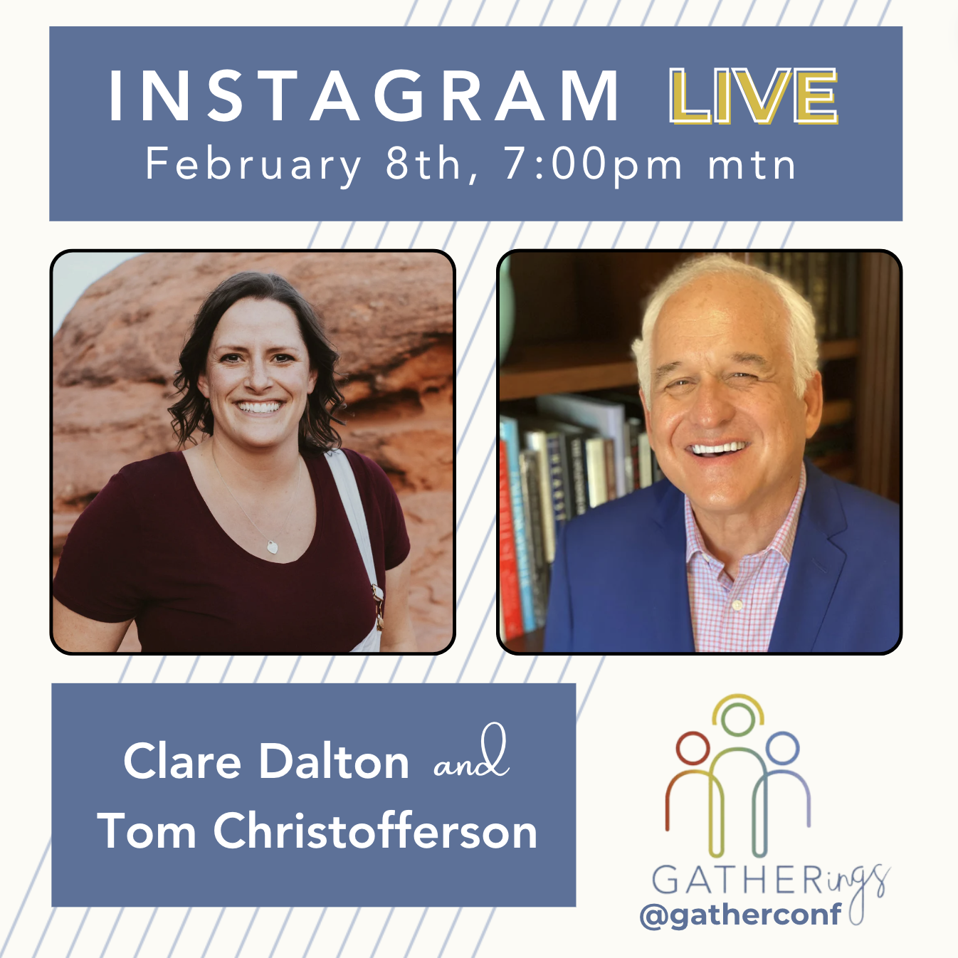 Back to All Events Gatherings LIVE on Instagram (online) Thursday, February 8, 2024 7:00 PM 8:00 PM Lift + Love Salt Lake City, UT United States (map) Google Calendar ICS Live Instagram broadcast featuring Gather Conference Advisory Board members Clare Dalton and Tom Christofferson. Find us LIVE on Instagram Thursday, February 8th at 6pm Pacific / 7pm Mtn / 8pm Central / 9pm Eastern @gatherconf